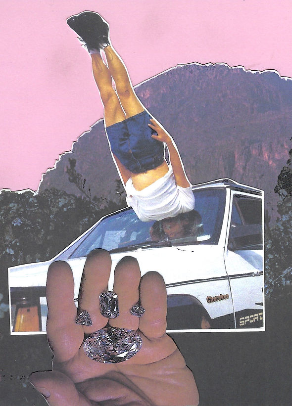 Dans ma pratique artistique, je collectionne et rassemble divers éléments et objets, tactiles ou visuels pour leurs qualités formelles ou affectives. À l’aide de ce répertoire plastique et personnel, j’explore le collage et l’assemblage autant dans mes recherches en installation, en photographie, en sculpture que dans son utilisation plus directe comme ici dans l’œuvre Mais l’important c’est pas la chute, c’est l’atterrissage. En fouillant de manière intuitive dans ma collection de magazines, de découpures d’images, de textures et de couleurs, la composition qui s’est imposée m’a rappelée une citation tirée du film La Haine (Matthieu Kassowitz, 1995) qui est donc devenue le titre de l’œuvre.